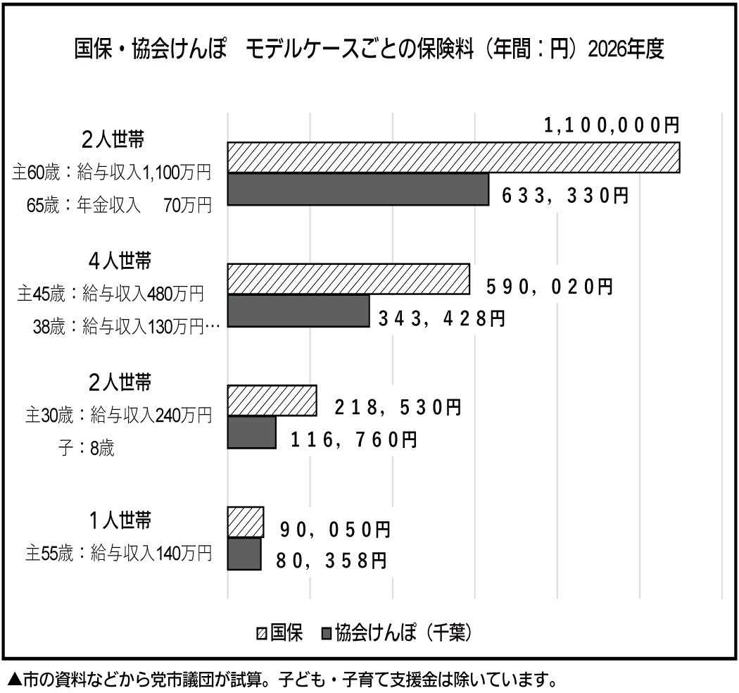 市は「国保は社会保険であり、相応の受益者負担だ」としますが、同じ公的医療保険の協会けんぽと比べても高すぎます(表参照)。加えて国保には傷病手当金や出産手当金もなく、受益者負担論の破綻は明らかです。