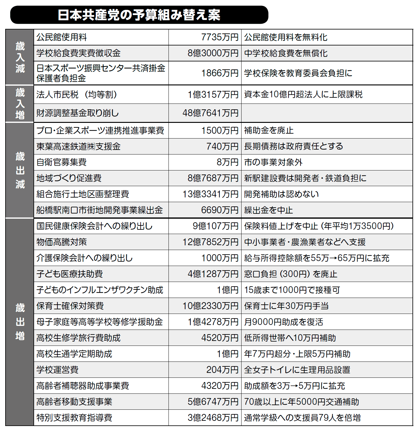 共産党は3月18日、一般会計予算の組み換え動議を提出し、要求実現の必要額を議会で明らかにしました(左表参照)。採決で組み換え動議に賛成したのは共産党のみであり、否決されましたが、実現に向けて引き続きがんばります。
