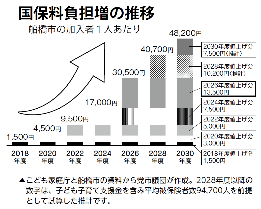 国民健康保険料の大幅値上げが自民・民主・公明など、オール与党の賛成多数で可決されました。被保険者一人あたりの平均で、年1万3500円もの負担増です(国保料9500円+子ども・子育て支援金4千円)。2018年度からの通算では同3万500円です。市民生活と地域経済に大打撃です。