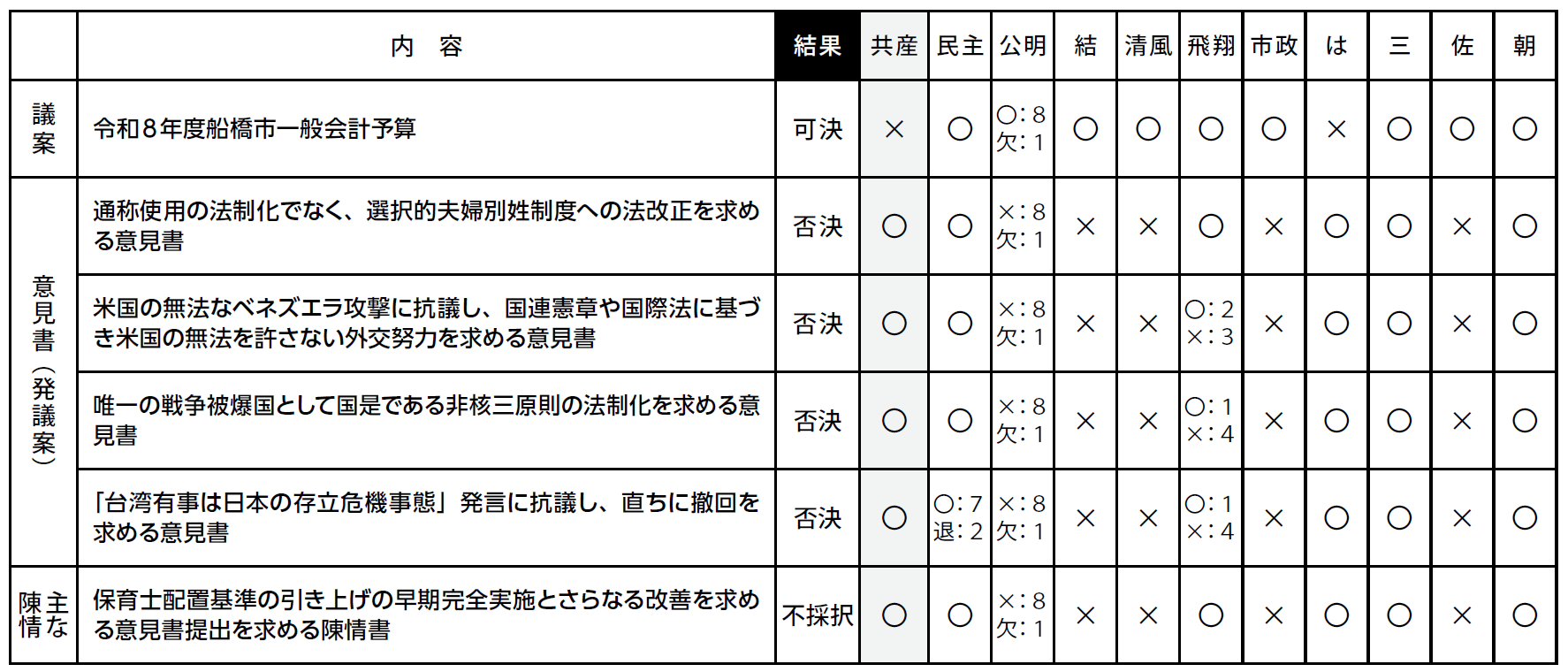【○=賛成 ×=反対 退=退席 欠=欠席】